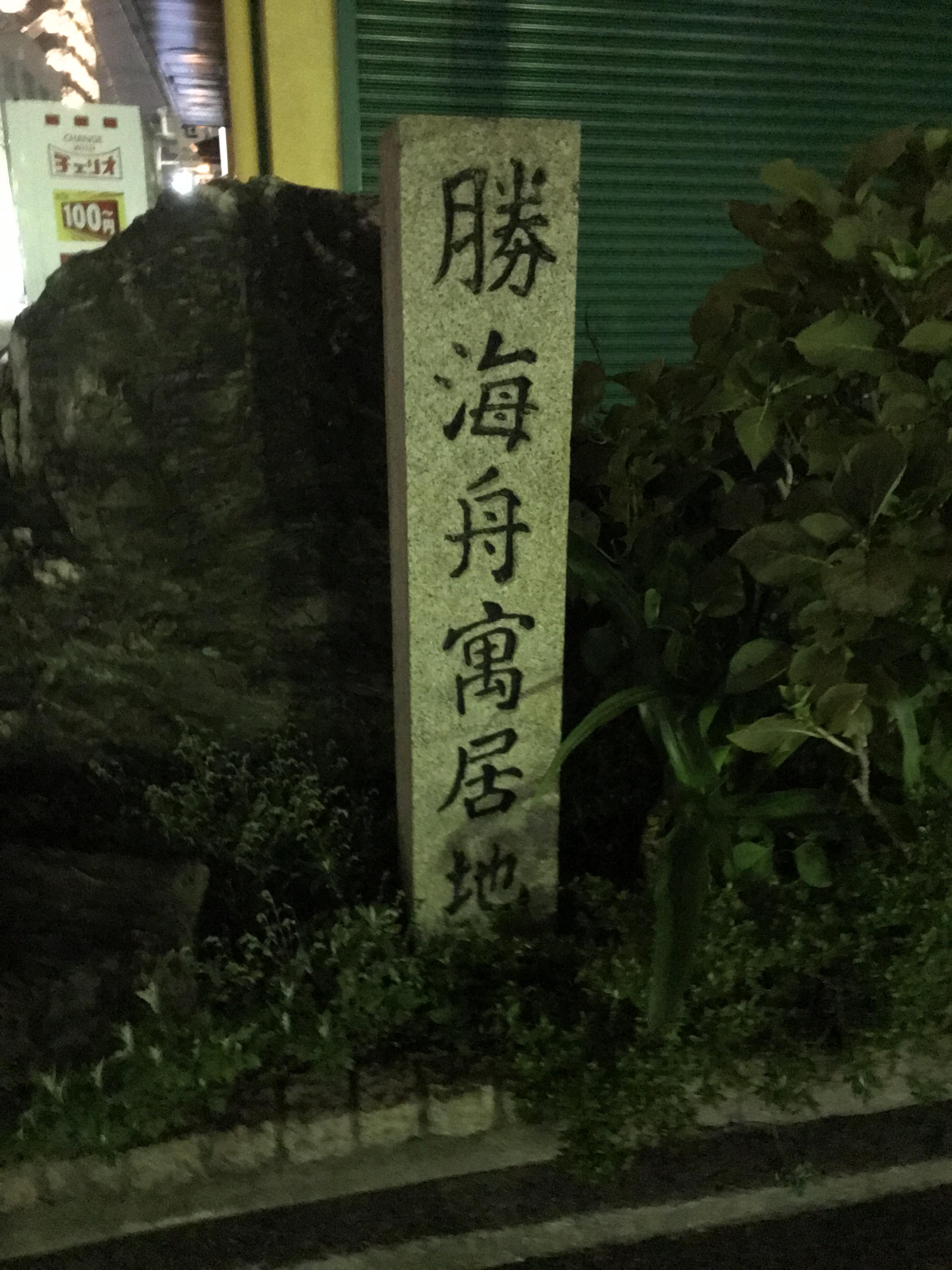 和歌山市駅近くの「はいろや」さんで晩ごはんをいただいた後、和歌山城近くのホテルまで1kmぐらいってのがわかり、歩いて帰ることに。 夜は涼しくてとても気持ちがいい。 と、道の途中に「勝海舟寓居」なる石碑が。 えーここに勝海舟住んでたのーって幕末ファンとしては嬉しい発見が。 調べてみたらなんと坂本龍馬も一緒に来てたとかなんとか。すごーい。 で、コンビニでお酒やらおつまみ買ったりしてホテルに到着。 ホテルから見える和歌山城はきれいにライトアップされていてお昼とはまた違う表情。 和歌山城見ながらまったり飲みだなんて贅沢だなあ。